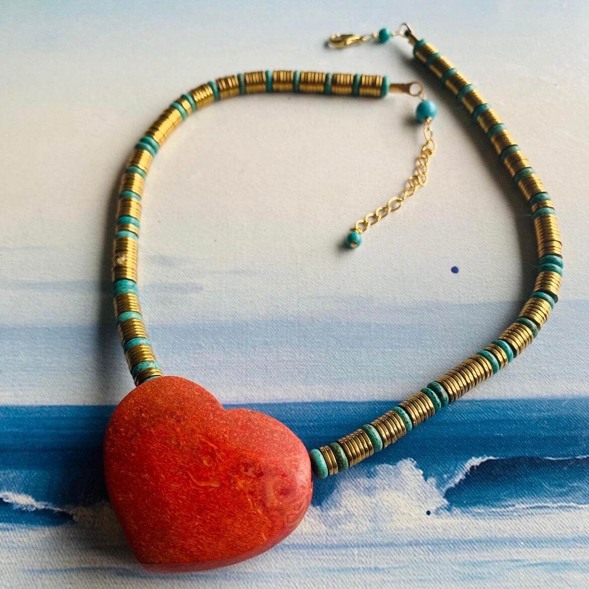 Coral Heart, Turquoise and Hematite Pendant Necklace