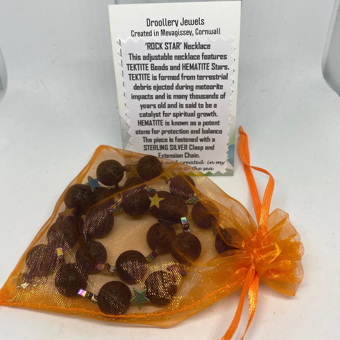 This adjustable necklace features TEKTITE Beads and iridescent HEMATITE Stars which catch the light beautifully. TEKTITE is formed from terrestrial debris ejected during meteorite impacts and is many thousands of years old and is said to be a catalyst for spiritual growth. HEMATITE is known as a potent stone for protection and balance. The piece is fastened with a STERLING SILVER Clasp and Extension Chain.